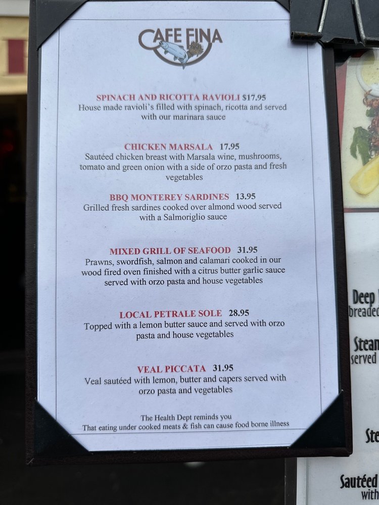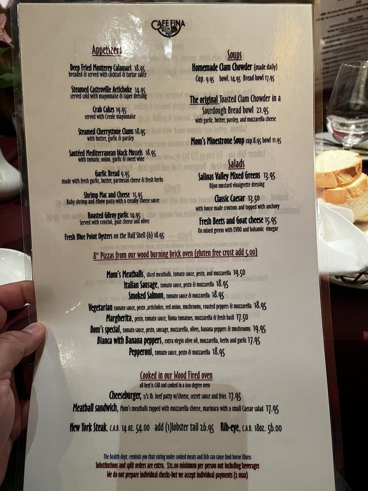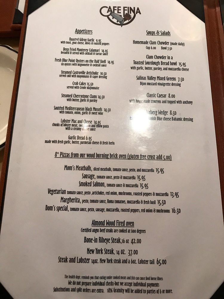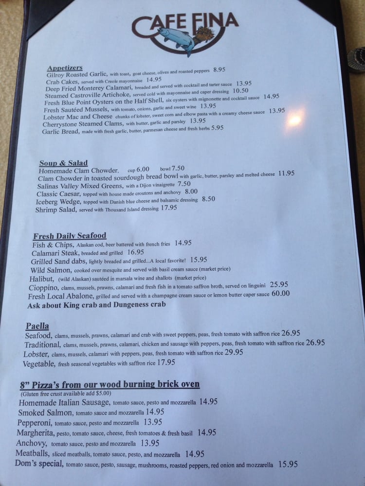 Cafe Fina, located in Monterey, CA, offers a diverse menu of Italian, seafood, and steakhouse dishes. With a range of vegan and vegetarian options, the restaurant accommodates various dietary preferences. The atmosphere is casual yet welcoming, perfect for group gatherings or family dinners. The menu features mouthwatering pizzas like Dom's Special and Mom's Meatballs, alongside appetizers such as Blue Point Oysters and Crab Cakes. Soups and salads like Boston Clam Chowder and Chicken Caesar Salad are also popular choices. Customers rave about the exceptional food quality, with some even suggesting that Cafe Fina deserves a Michelin star. The attentive service and warm ambiance further enhance the dining experience, making it a go-to spot for special occasions or casual outings. Whether you're a seafood lover or a pizza enthusiast, Cafe Fina has something for everyone to enjoy.